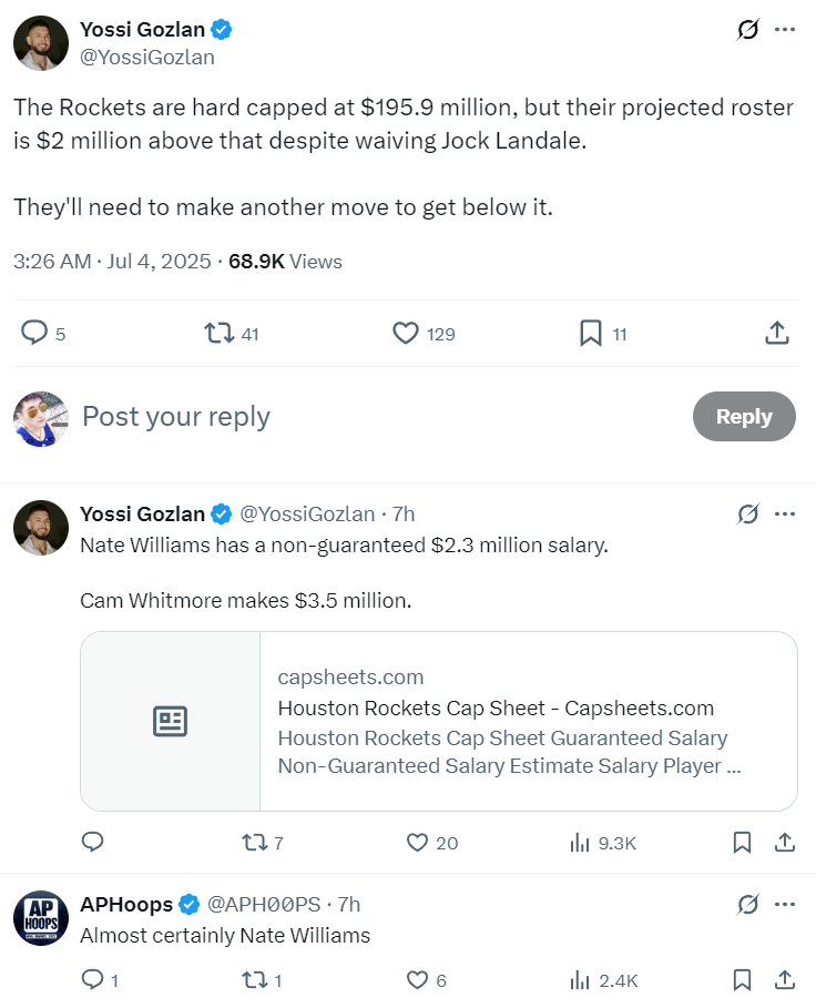 不过根据薪资结构专家Yossi Gozalan与美媒APHoops的说法,火箭完成交易后+裁掉乔克-兰代尔800万的合同还超过第一土豪线(1.959亿)200万,火箭队会裁掉内威价值230万的不保障合同来避税。