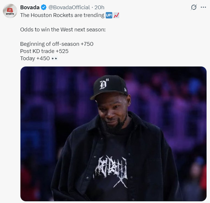 根据美媒Bovada的报道,火箭队在进入休赛期时西部冠军的赔率+750,在换来KD后+525,如今已经是+450,火箭已经成为西部冠军的大热门。(夺冠赔率上火箭也仅次于雷霆)