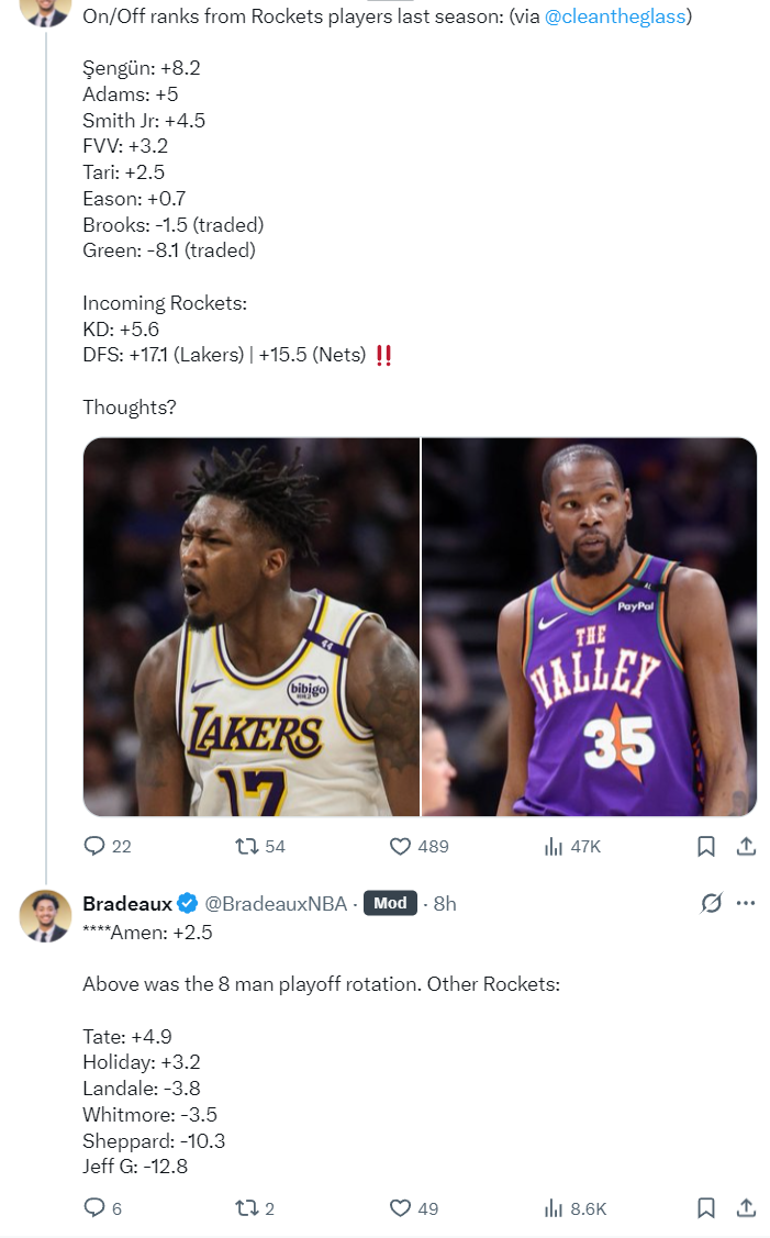休媒Bradeaux也晒出了火箭新阵的正负值:申京+8.2、亚当斯+5、范乔丹+3.2、小贾+4.5、伊森+0.7、阿门+2.5、KD+5.6、芬尼史密斯(湖人+17.1、篮网+15.5)、泰特+4.9、霍勒迪+3.2。(谢泼德-10.3、杰夫格林-12.8、白魔-3.5、卡佩拉-1.4)